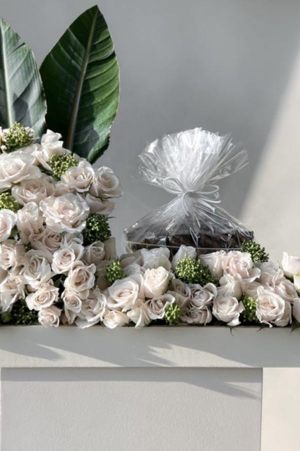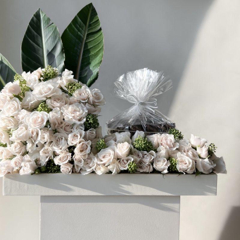 wooden tray Fresh flowers 0.5 Kg pecan slabs chocolate from NOR Flowers might be changed upon availability
